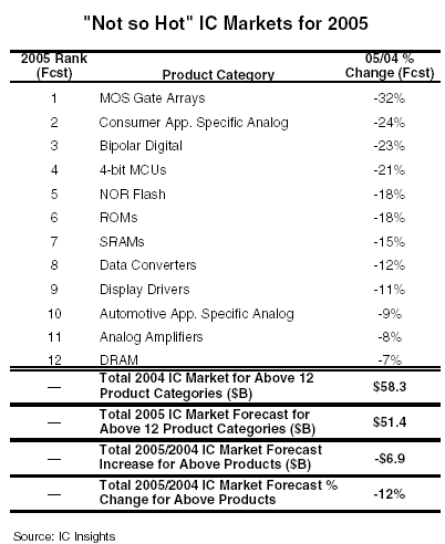 分别预测了2005年十大热门IC产品和十大非热门IC产品。